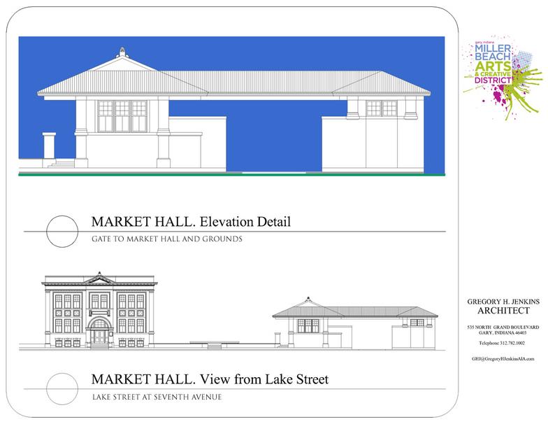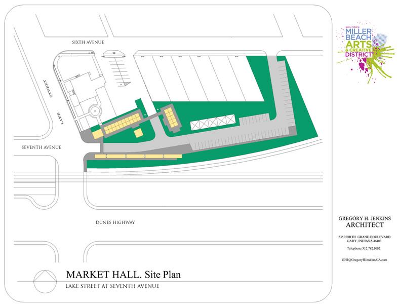A "Market Hall" is an outdoor exhibit area for art exhibits and farmers markets. Thirty exhibit spaces are planned (yellow spaces). This area is south of the South Shore Dance Alliance Building (Old Miller School). This will be the "gateway" to the District.